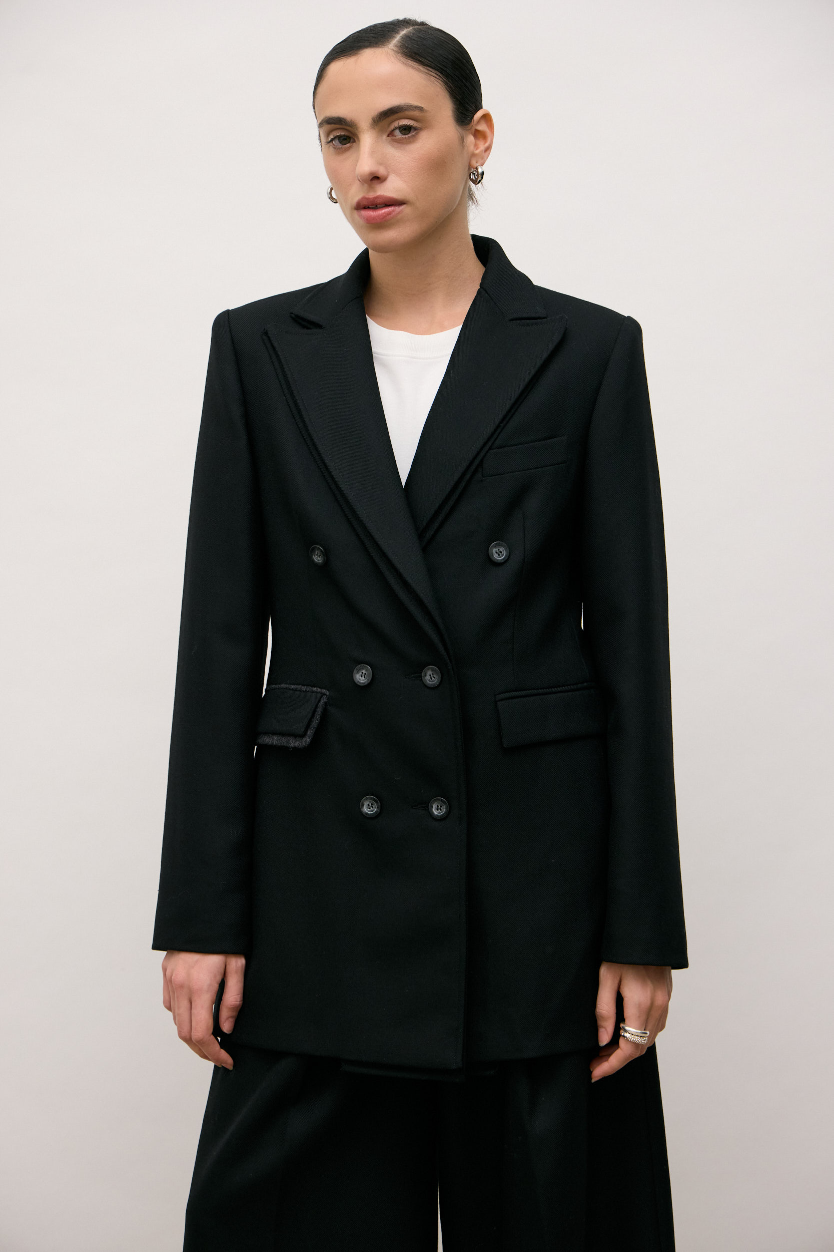 Front flap pockets with raw edge detailing